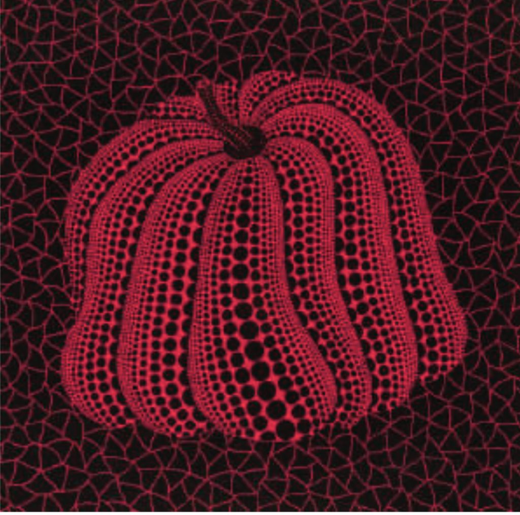 黄色いかぼちゃが代表作として知られていますが、赤、青、緑などカラーバリエーションがあったり、草間彌生の生家である種苗店から葡萄や果物などのモチーフや、インフィニティネットや水玉のようにモチーフのない抽象的な作品も多数あります.